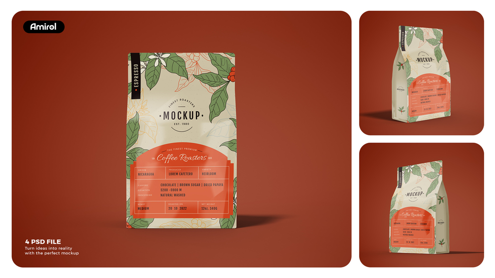 Present your branding, packaging, or logo design with this realistic coffee bag mockup. Perfect for coffee shops, roasters, graphic designers, and creative entrepreneurs who want to showcase their packaging designs in a professional and stylish way. High Resolution mockup with realistic product, easily customize with organized named layers, this mockup will be your best showcase of your product. Infinite possibilities are fast and easy to create in a few clicks. All object are customizable in every detail like device color, shadow, reflection, and ambient shadow strength.